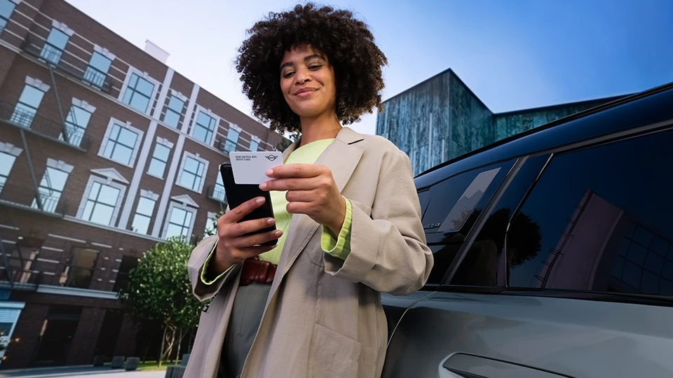 Beroende på land, modell och utrustning för din MINI med MINI Operating System 9, kan du låsa upp och starta din MINI med MINI Digital Key Plus med hjälp av Teletjänster (6AE) och Comfort Access (322) tillsammans med din smartphone eller smartwatch. Om ditt land och din mobila enhet har stöd för standarden Ultra-Wideband (UWB), låser din MINI upp sig automatiskt när du kommer nära. Fler smidiga funktioner finns i din smartphone eller smartwatch och i MINI App. Allt som behövs för att starta motorn är att din mobila enhet befinner sig i kupén. Om UWB inte stöds sker dataöverföring via Near Field Communication (NFC), vilket kräver att du håller din smartphone eller smartwatch mot dörrhandtaget och placerar den i smartphone-facket för att starta motorn.